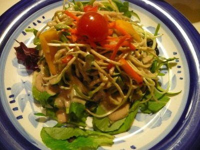Create noodles with spiralizer or by cutting them julienne. Carrots, zucchini, dikon radish, sprouts, and red pepper are all delicious in this dish. Place noodles on a bed of baby greens or torn up kale, cover in sauce and serve! For garnish you can use cherry or grape tomatoes, carrot slices, cilantro or even mint. Did I mention this dish is delicious?