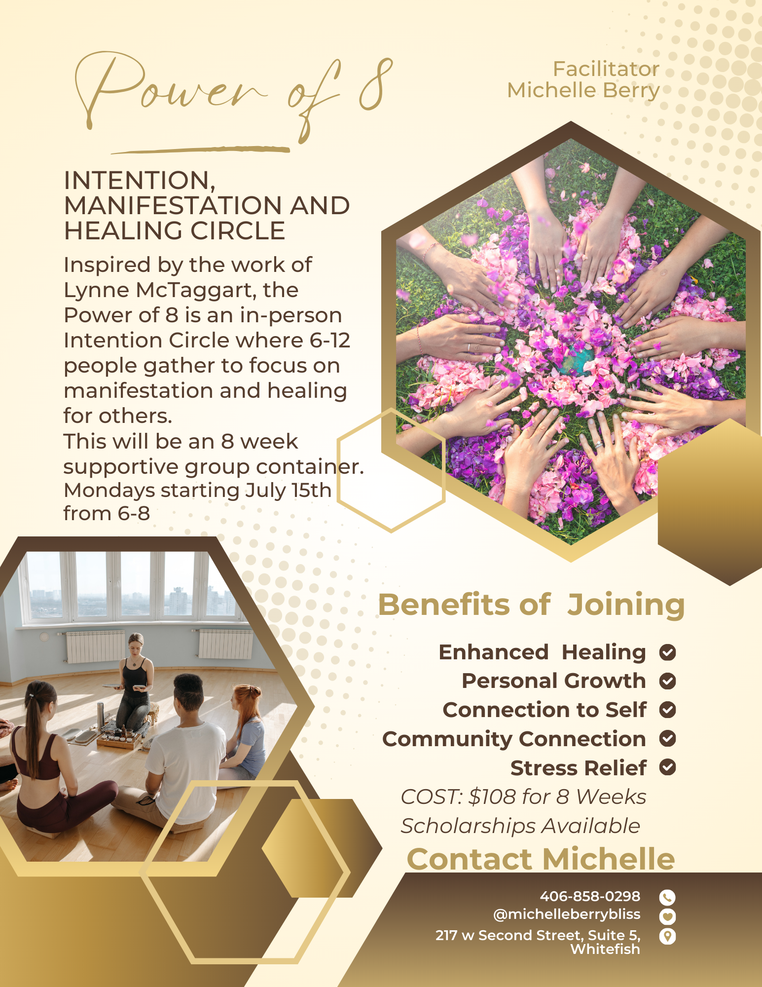 The Power of 8 group is an in-person Intention Circle that unites 6 to 12 individuals with a shared purpose: to focus collective energy on manifestation and healing. This concept, introduced by Lynne McTaggart in her book “The Power of Eight,” reveals the extraordinary power of group intention to catalyze profound change and healing in individuals’ lives.